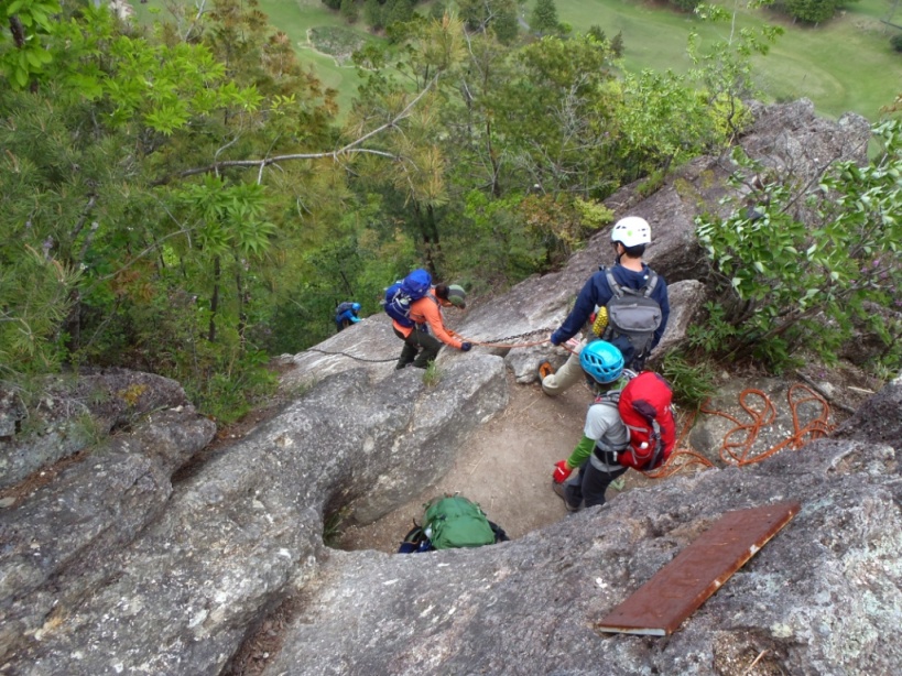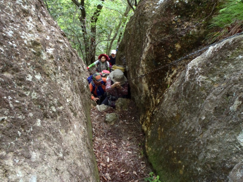 狭い岩の間をクサリで強引に。
