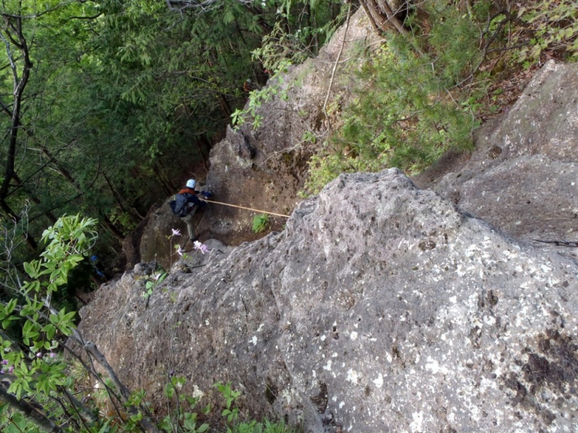 下で二段目の下りのザイルをセットしています。