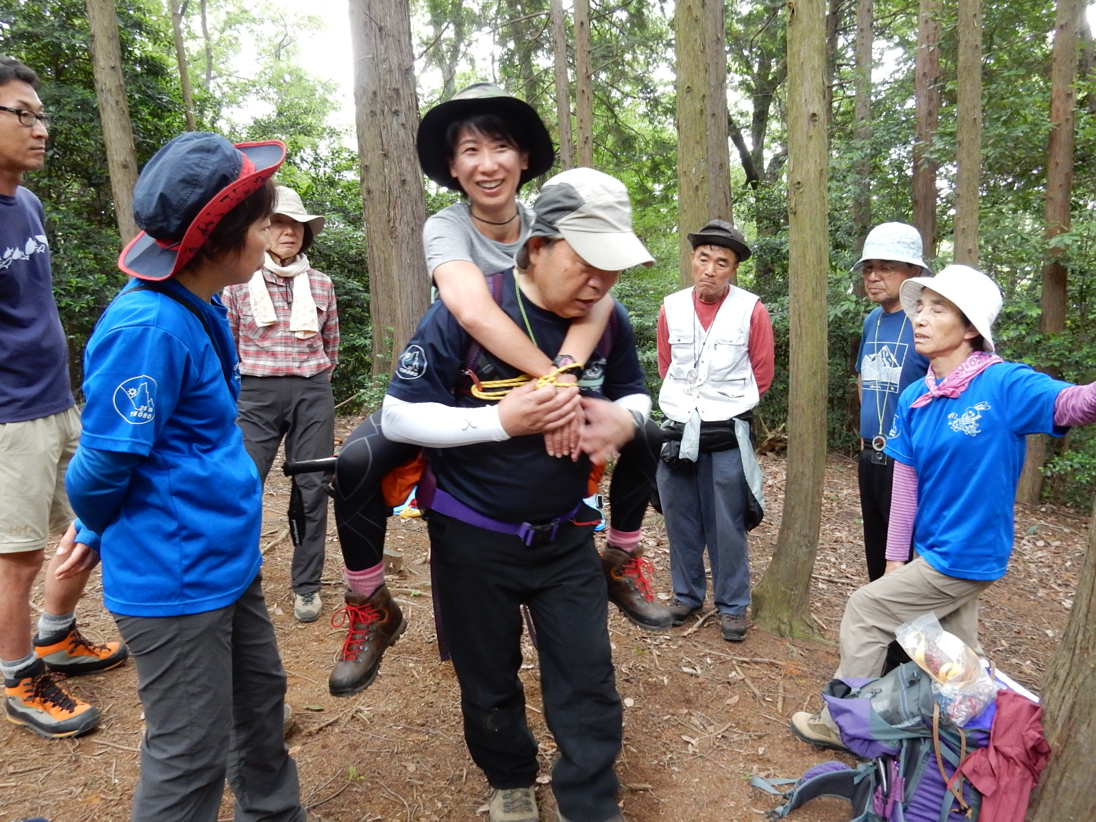 新入会員講座・実技編 未分類 2016.06.202016.09.08 2016年6月19日(日) 日和田山にて 参加者:10名(新人6名) みんなで地図を正置してみよう ここで進行方向の確認。コンパスを当ててね 歩幅は小さくネ。広いと疲れますよ 足場の確保。段差が少なくなるように 三点確保して、つぎの一歩を。 岩から身体を離して さぁやってみよう あれ…! 足場はどこ ガスコンロはやけどしないようにネ みんなで記念撮影 けが人の搬送 ザックやポールを補助にして背負う。 今日の講習はこれですべて終了。おつかれさま