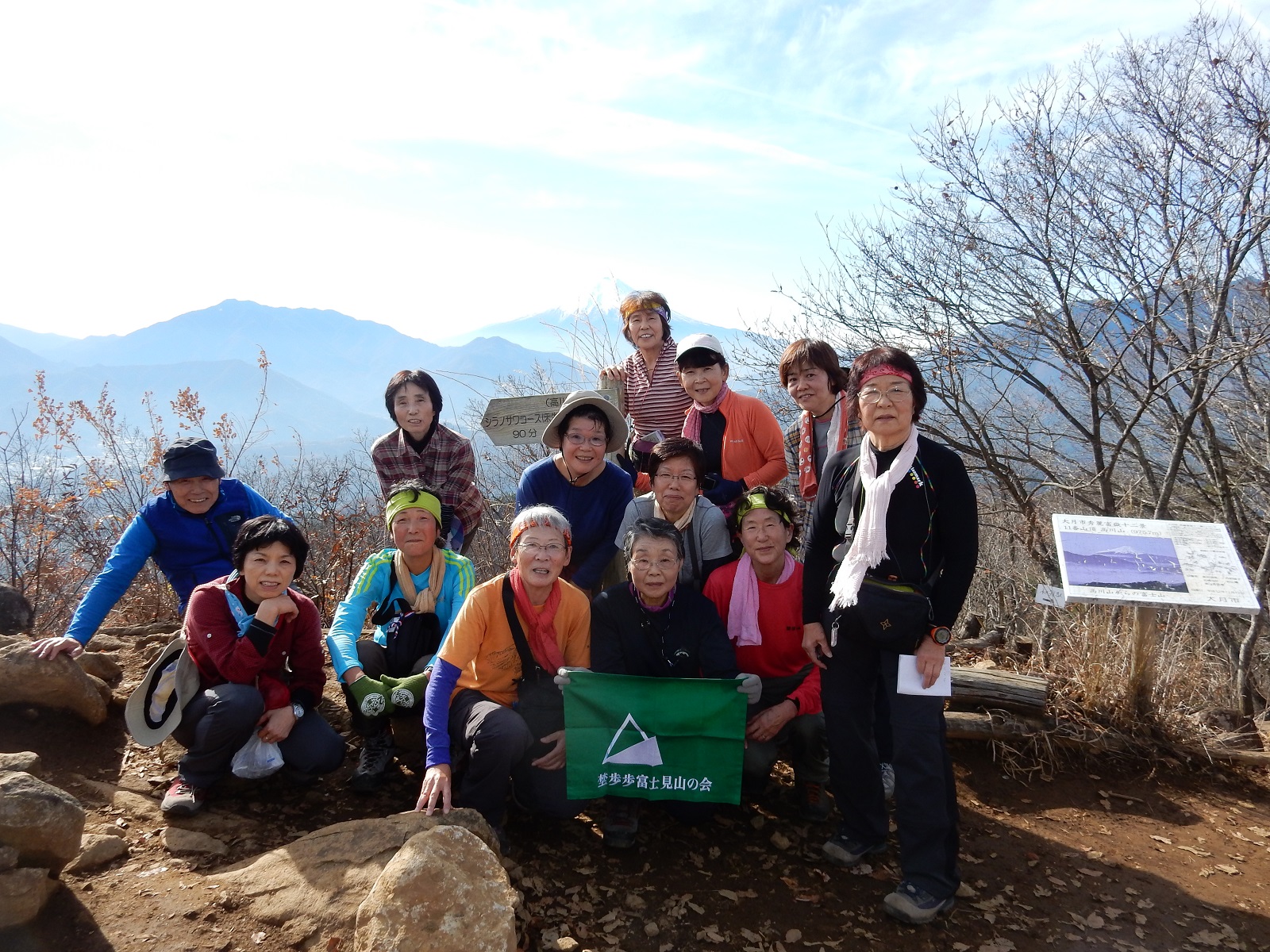 12月会山行 高川山 未分類 2016.12.052017.01.23 日時:2016年12月4日晴れ 参加者:13名 コース:初狩駅~登山口~女坂~高川山~古宿~川茂橋~禾生駅 背景はきれいに雪をかぶった富士山でした