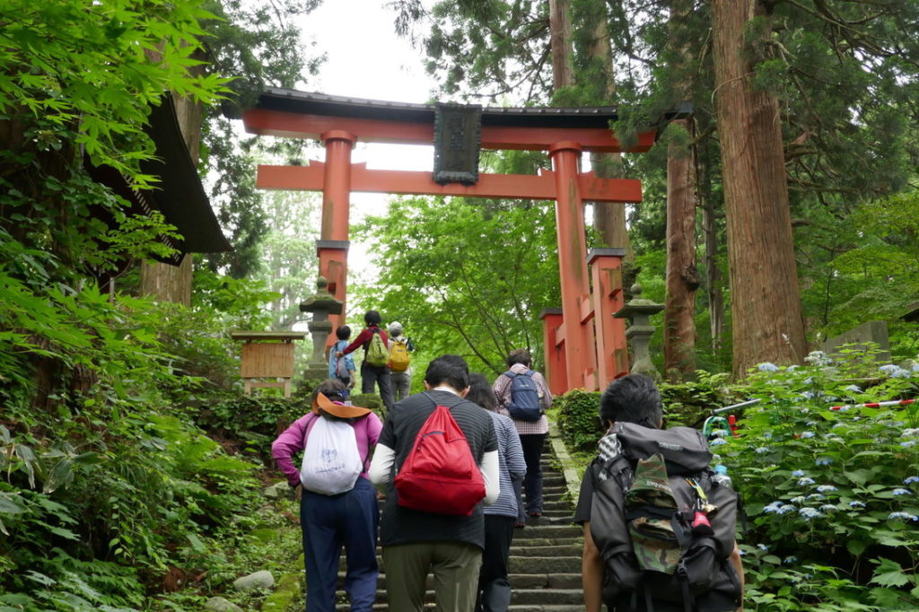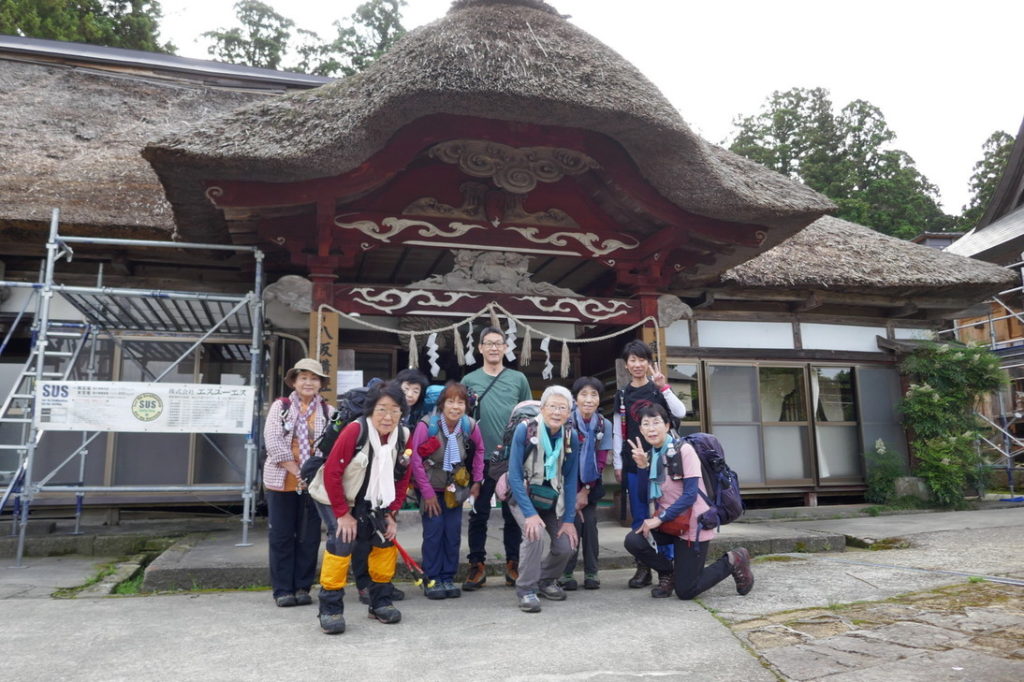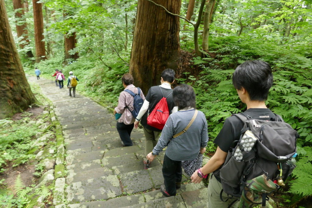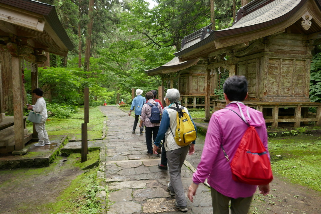 リーダー柴田憲彦 参加9人 コース:1 日目曇り・鶴岡駅集合 = 羽黒随神門=バス=宿坊神林勝金に荷物預け昼食 羽黒随神門…五重塔 …二の坂茶屋…羽黒山神社…羽黒山神社…宿坊神林勝金