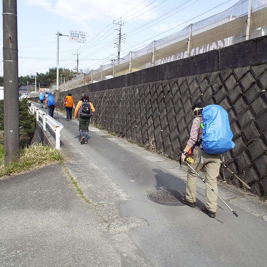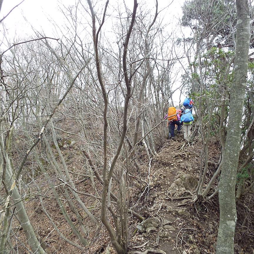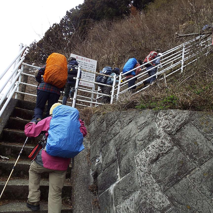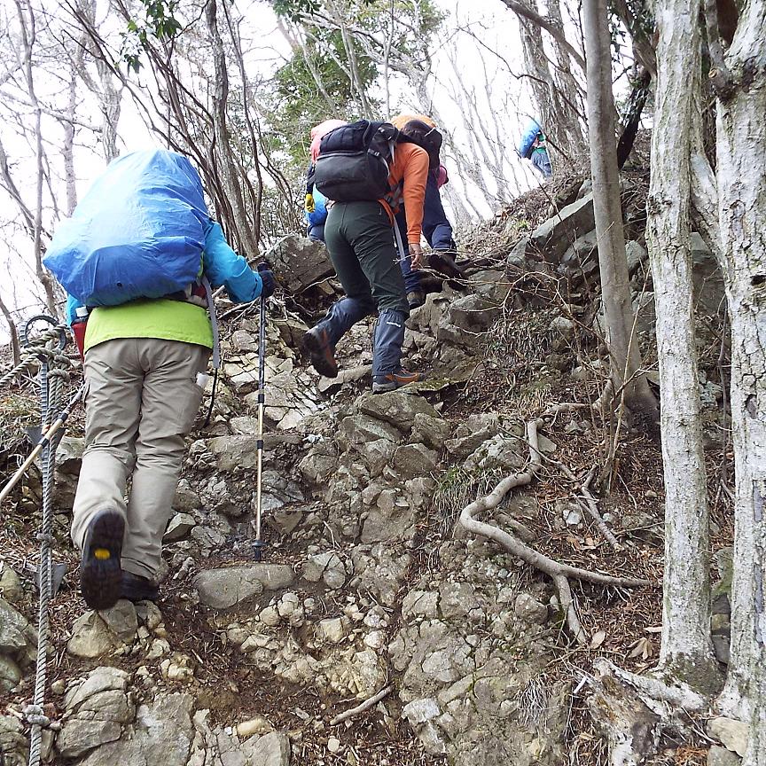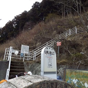 尾根末端が削り取られ、急な鉄梯子をよじ登る