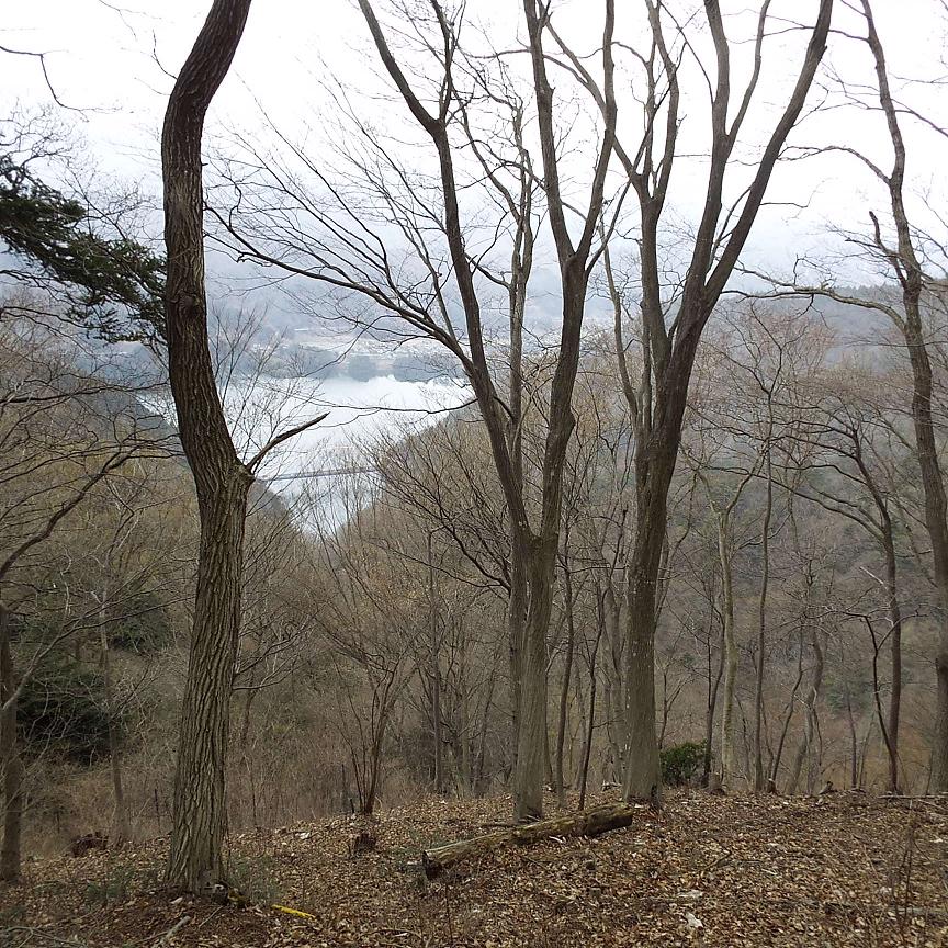 冬枯れの木立越しに宮ヶ瀬湖が見えました